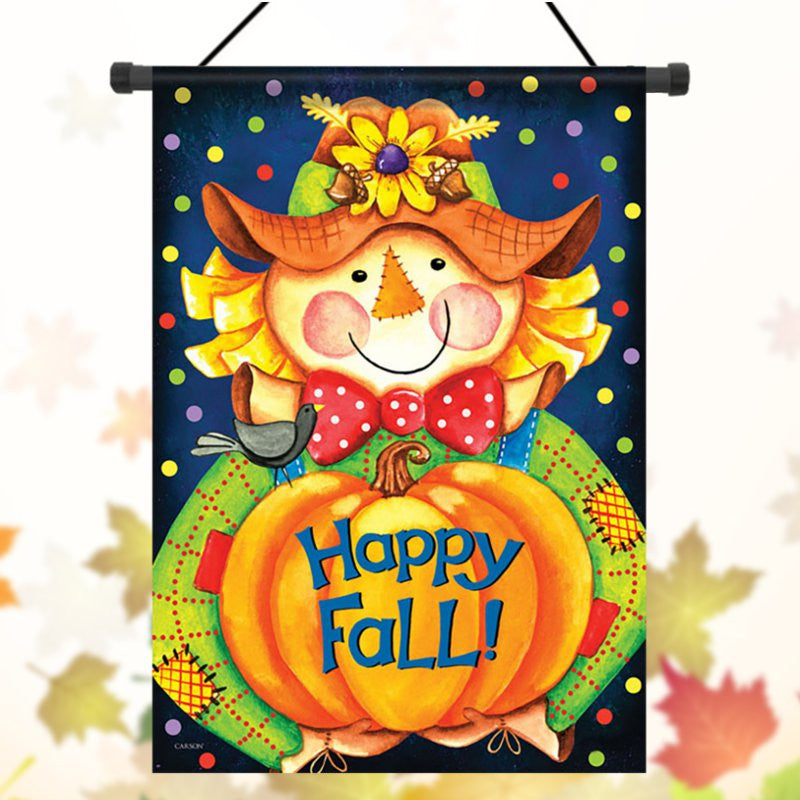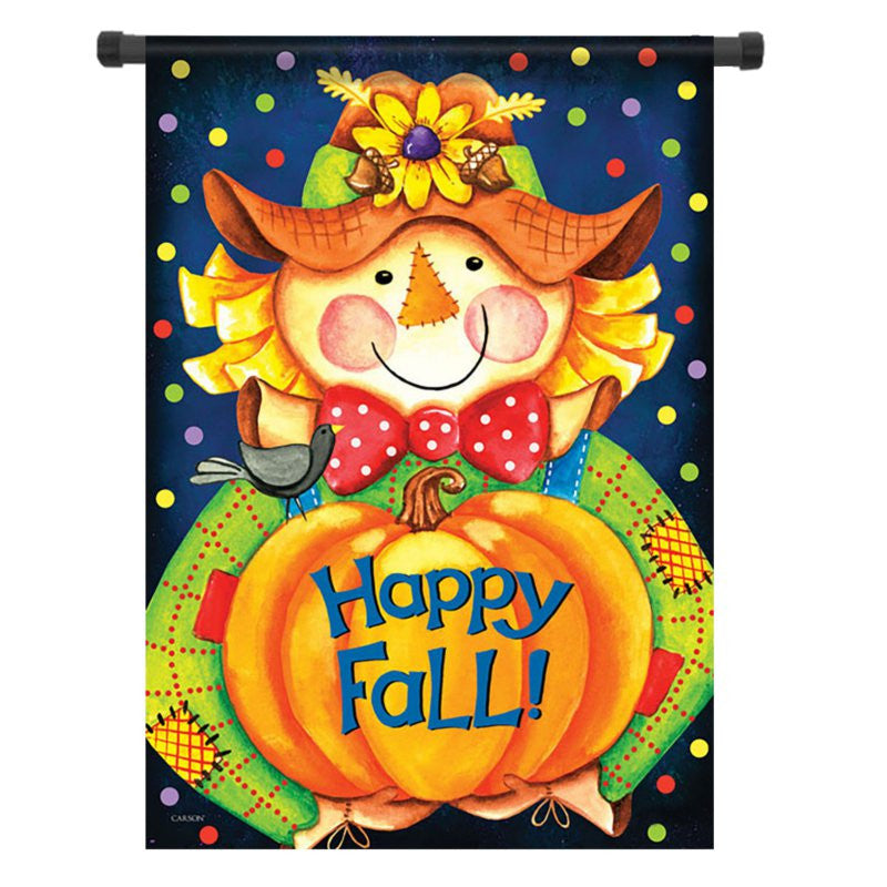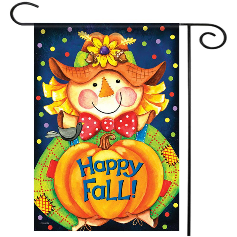 Our Cheerful Scarecrow, with his bright smile & colorful outfit may not scare off many crows but he certainly is a nice welcome for all of your visitors. Add a colorful, welcoming touch of the season to your home and garden with a premium decorative flag. Our original artwork printed on polyester material designed for outdoor display provides unique designs that are as durable as they are beautiful. 100% polyester fabric stands up to the weather and is mildew and fade resistant.