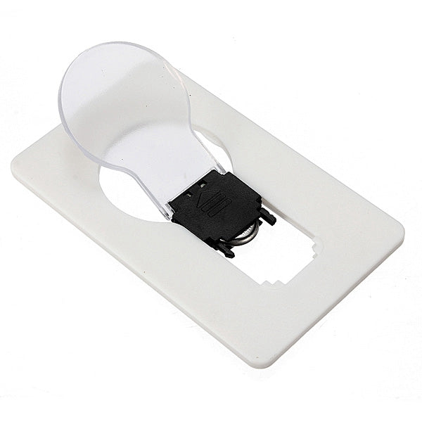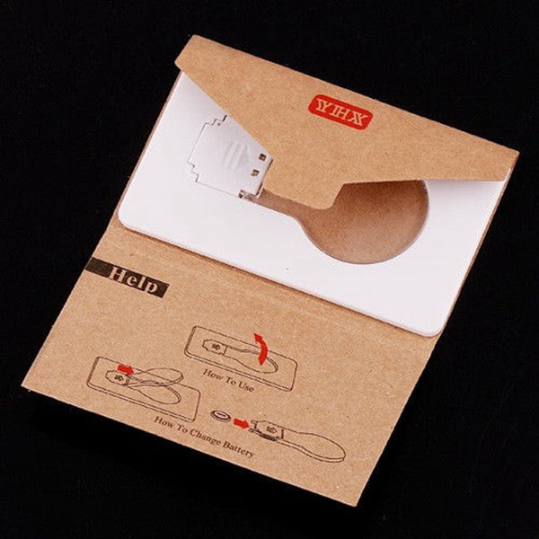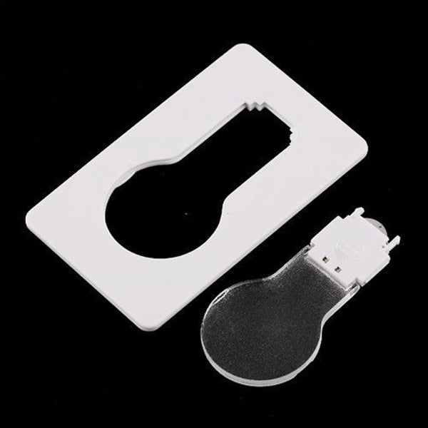 The size same as credit card and no wire needs. It is very convenient because it can place inside the wallet. A such small card may use for illumination, design is so funny. The interior has a LED light bulb, when you need to illuminate, you just fold "Light Bulb" up then the light turns on. If put " light Bulb" down, then the light turns off. You can use it anytime and anywhere!!!