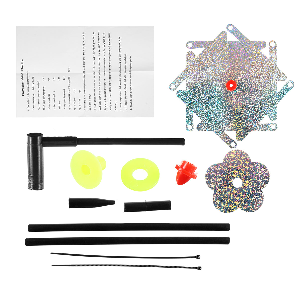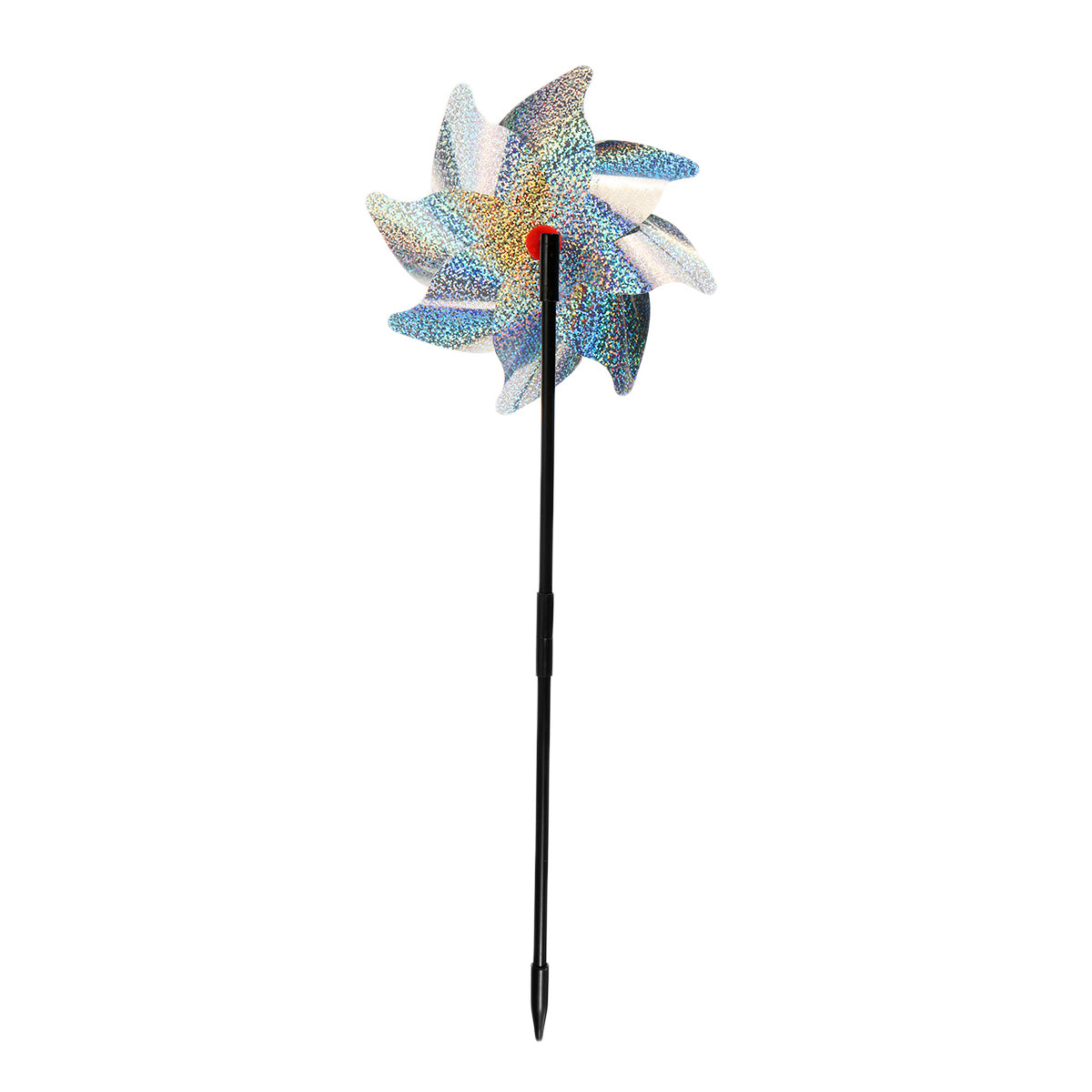 -Through the reflection of the sun rays to confuse bird's eyes.This sparkly holographic pinwheel spinners can move easily in the breeze to emit a clear metal-like sound that will deter birds from moving away from the area.