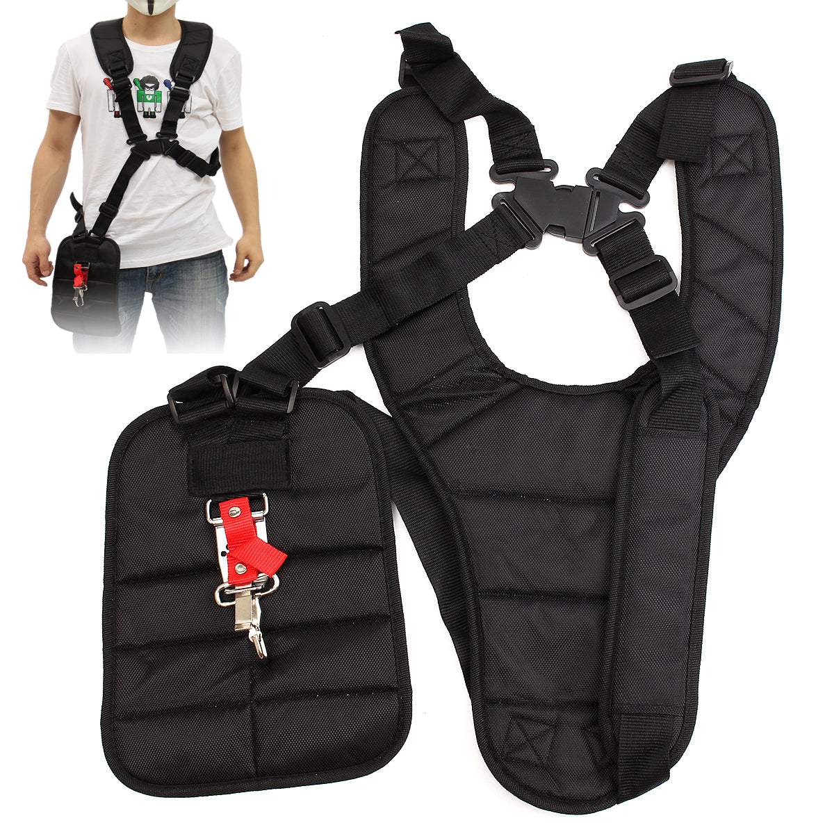 - Gives you safer and easier grass trimming. - Safety and comfort are the key to the grass trimmer shoulder strap. - Waist band can be adjusted to suit with a simple easy to use buckle. - The strap won't dig into your shoulder, because it has an impact softening shoulder pad. - Takes the strain away from your hands and wrists, and distributes the load evenly across your shoulder. - This is a universal double shoulder harness to suit many makes and models trimmers, strimmers and brush cutters,like for STIHL, Husqvarna, ECHO. - It is designed to fit nearly all makes of electric and petrol trimmers, however big or heavy they are.Once the strap has been attached to the trimmer it remains firmly in place, until you decide to release it.
