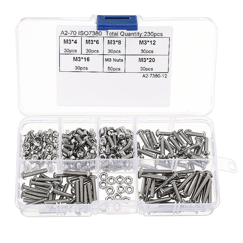 Suleve™ M3SH3 M3 hex socket button head screws nut, totally 230pcs. 304 stainless steel solid construction, exquisite workmanship. With 6 different lengths of screws, suitable for your various needs.