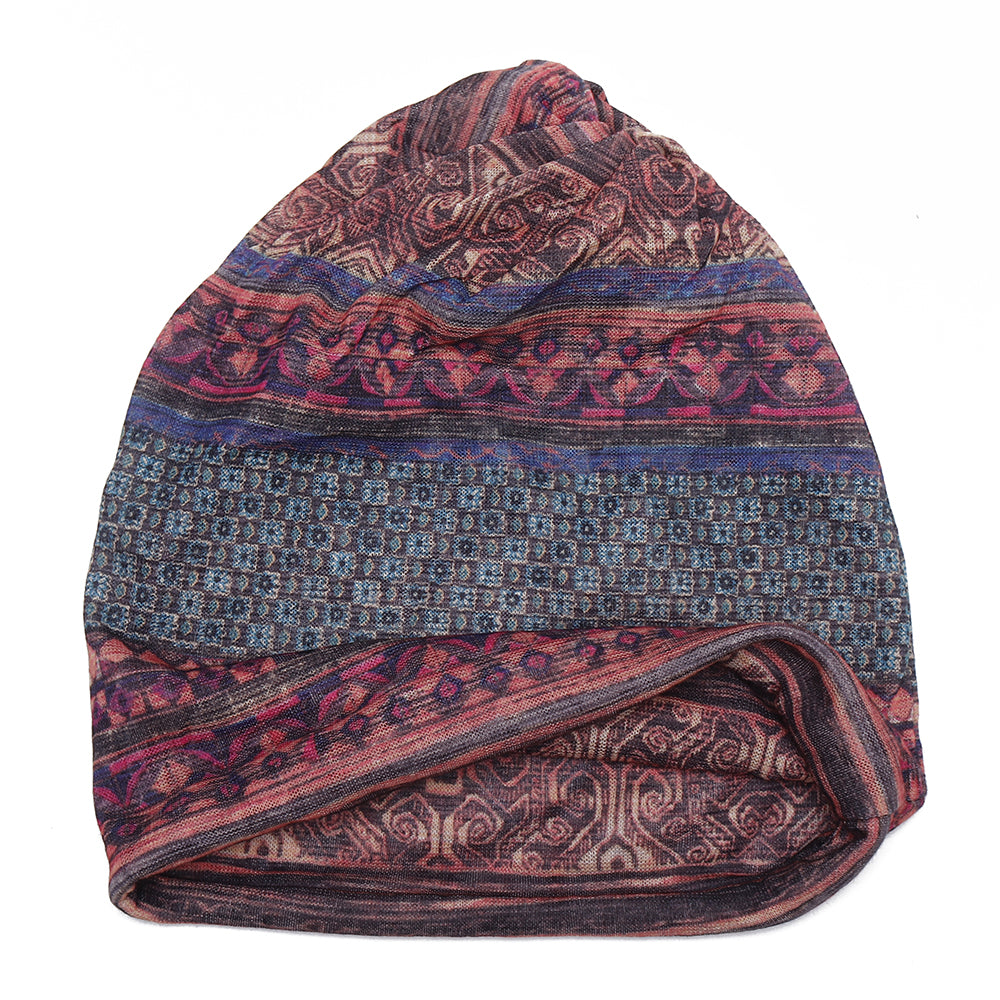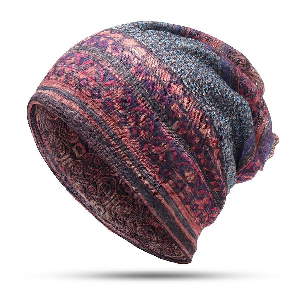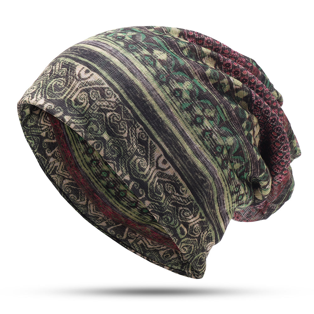 Womens Ethnic Stripe Double Layers Beanie Hat Outdoor Slouch Brimless Cap