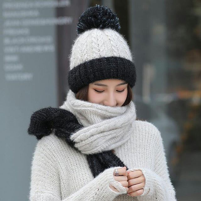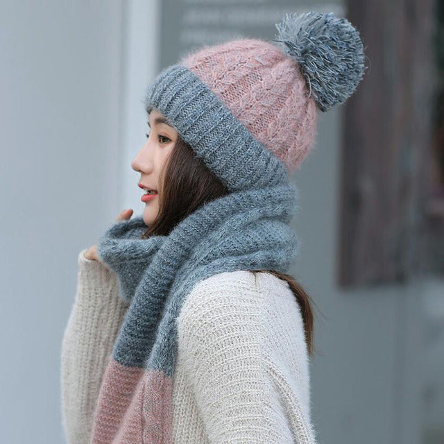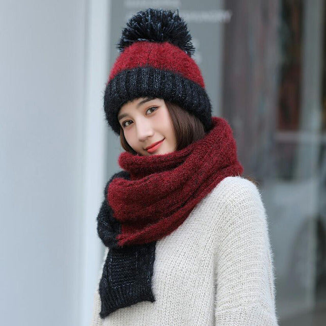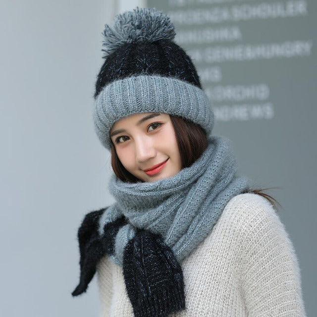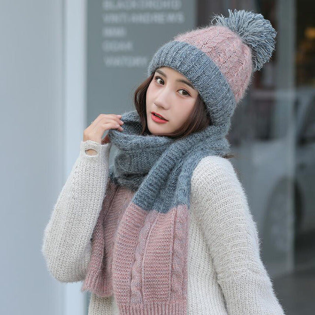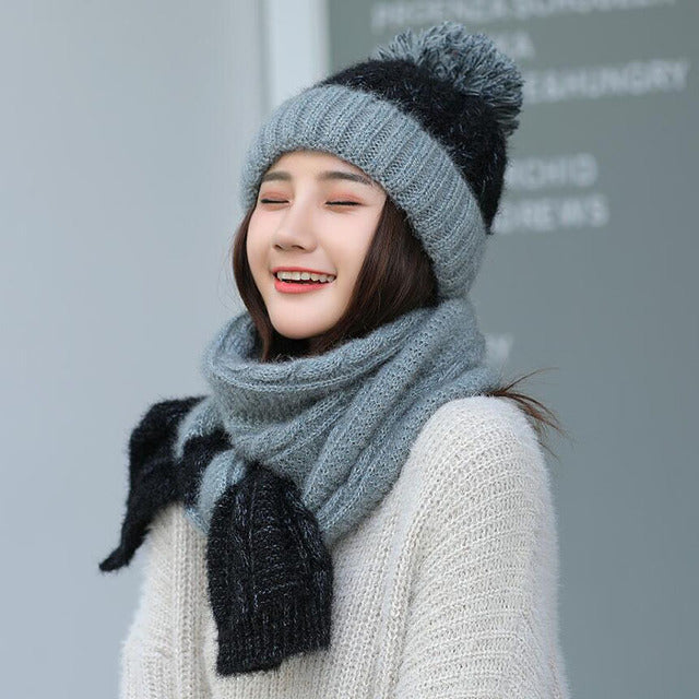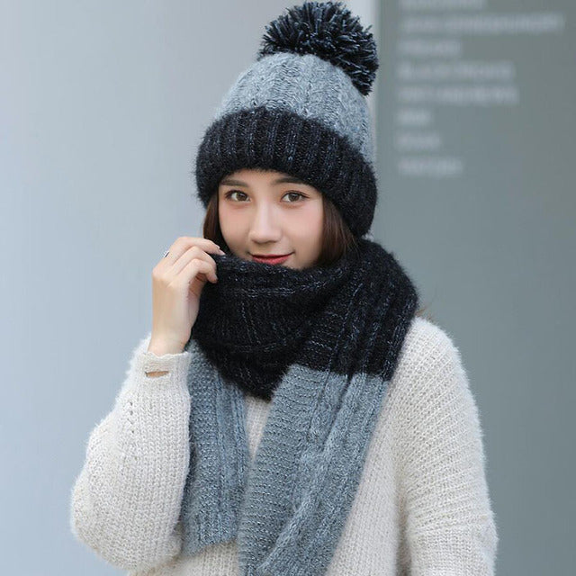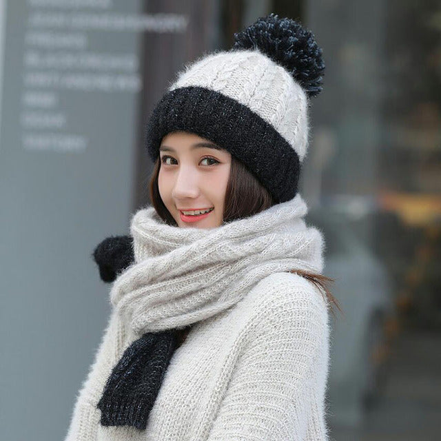 Knitted Beanie Pom Pom Scarfs Set Two-piece Set Thickening Warm Bobble Hat