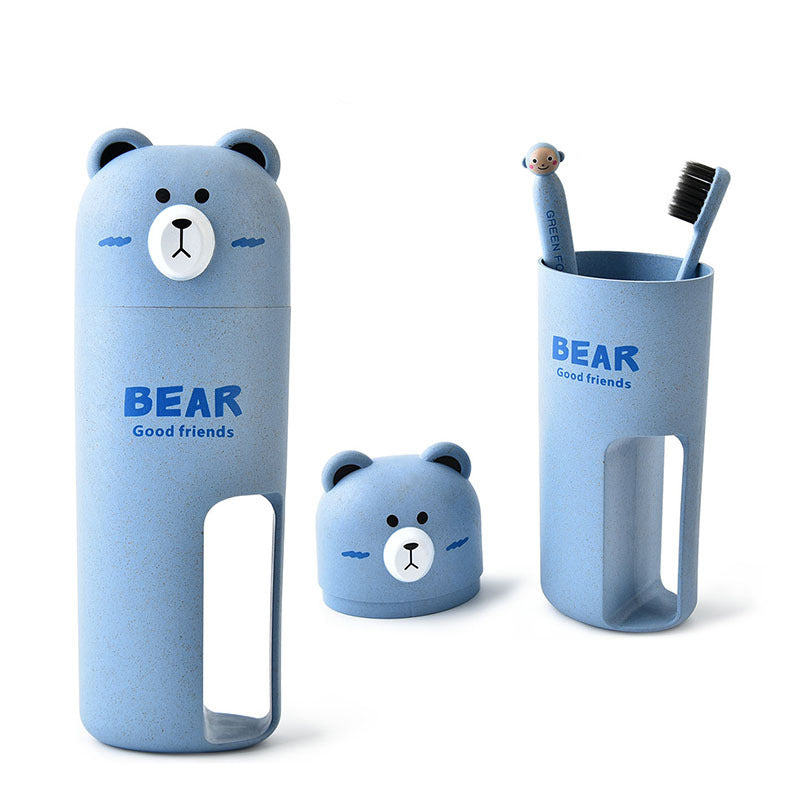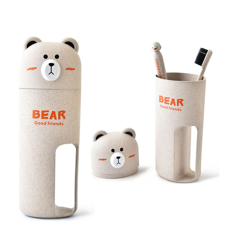 The product is a travel washing cup set includes 2 bamboo charoal toothbrushes for your trip or bussiness trip. Made of safe wheat straw material, durable, non toxic, odourless and eco-friendly. Cute cartoon bear design cover, keep clean washing set for you. With this 3 in 1 product you don't worry about how to storage your toothbrush and toothpaste in luggage, it's space-saving.