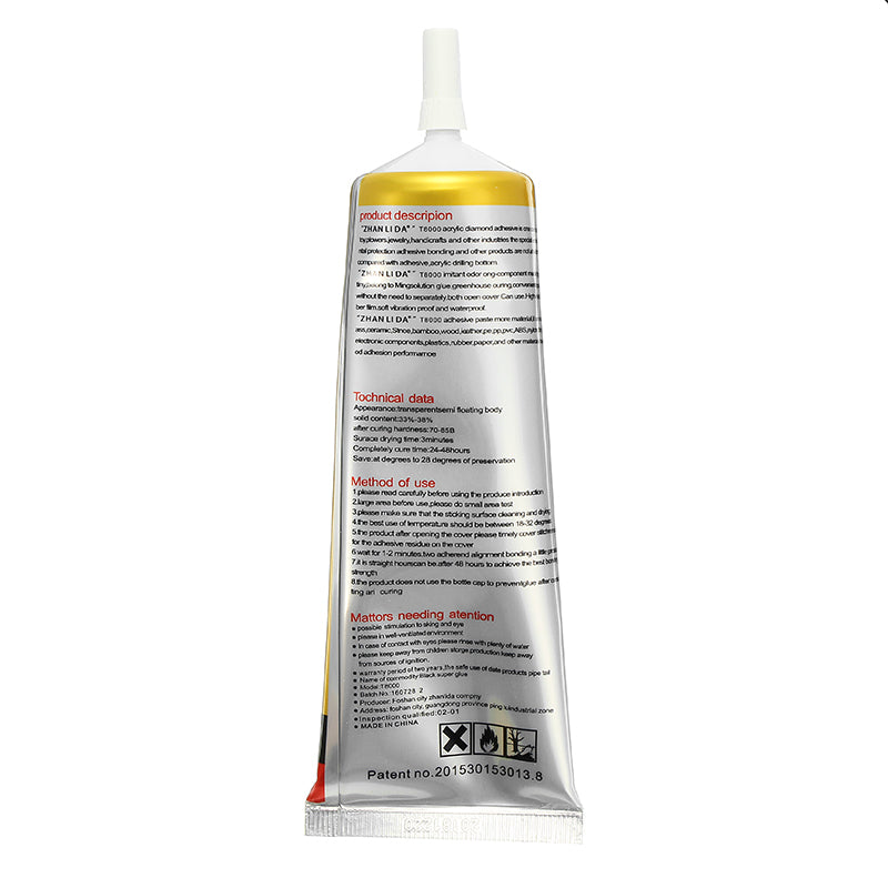 T8000 adhesive is suitable for vairous materials, such as metal, wood, glass, arcylic, ceramics, stone, bamboo, cloth, shoe, leather, PE, PP, PVC, ABS, nylon, sponge, film, textiles, electronic components, plastics, rubber, fiber, paper type, fiber glass, rhinestones, etc.