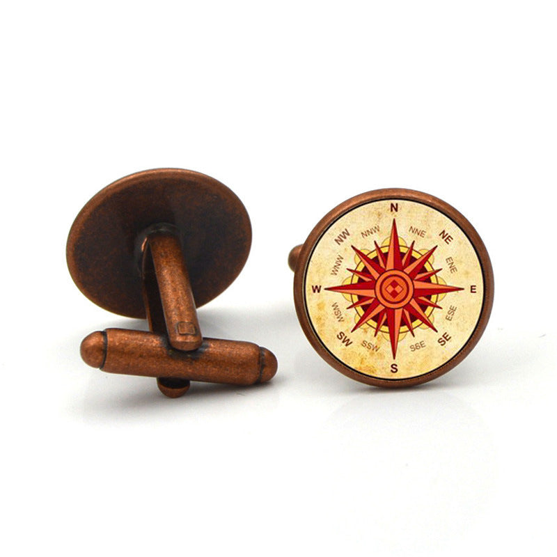 Vintage 1 Pair of Cufflinks Compass Disk Round Glass Zinc Alloy Collar Knot Tie Jewelry Accessories
